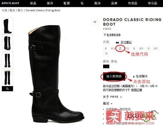 点击进入商品详细页面,选择“尺码”,然后点击“加入购物袋”。