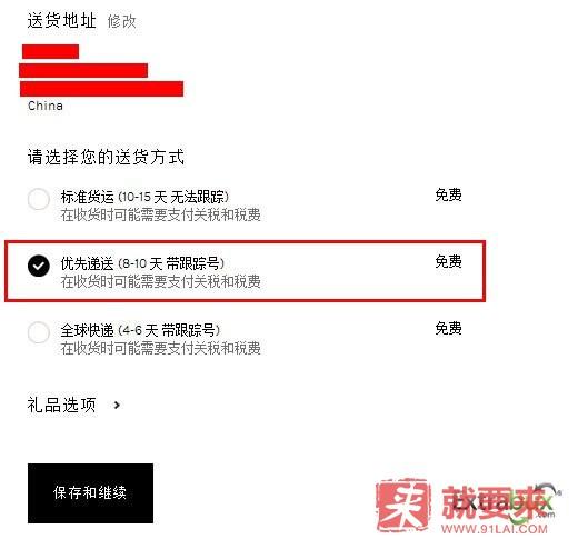 建议可以选择第二项或第三项,可以跟踪货物配送情况,在收货时可能需要支付关税和税费,如果被税的话。“礼品选项”是选择是否要加商品包装礼盒,需要另外收费,如果不需要可以略过,然后点击“保存和继续”到下一步。