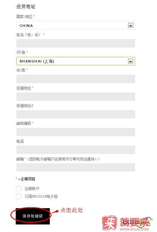 Revolve Clothing支持直邮中国,按照表单要求填写相关送货信息,名字用拼音填写,其他信息可以用中文填写,会有里面员工再进行翻译的,Revolve Clothing的中文服务做得还是挺好的。“必填项目”那里勾选第二项,然后点击“保存和继续”。