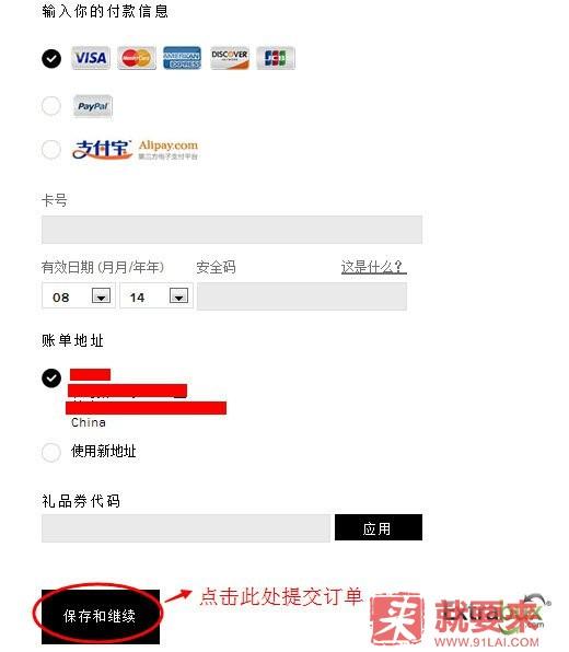 Revolve Clothing支持多种支付方式,同时支持支付宝支付,对于中国用户来说还是相当方便的。如果选择信用卡支付,需要填写卡号、有效日期及安全码;选择Paypal和支付宝支付,直接进入相应系统,然后点击“保存和继续”提交订单,就购物完成了。