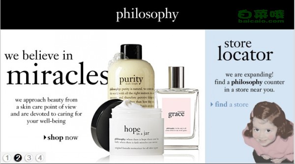 自然哲理Philosophy是来自美国的美容品牌,产品线包括身体护理、香水、彩妆、美发产品等,以hope系列最为出名,是当今全球最为流行的药妆品牌。
