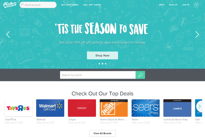 Raise是全球第一家点对点的礼品卡销售流通平台网站,客户可以购买自己所需的各大品牌礼品卡或者出售已有多余的礼品卡。与Raise合作的商家有:Mcdonald、MLB.com、LaneBryant、NineWest、Starbucks、Victoria’sSecret、Sephora、Gap等。