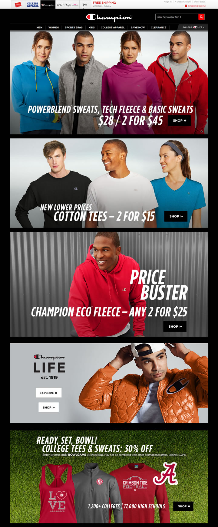 Champion——Authentic American Athletic Apparel -1919年Champion于美国罗彻斯特成立。1934年为防止汗衫缩水,首创了横纹编织技术。从世界上第一件连帽衫,到世界上第一件可正反穿T恤,再到世界上第一条尼龙网眼运动短裤…1992年巴塞罗那奥运会Champion作为唯一赞助商与美国梦之队一同力压群雄,从梦一到梦二,从NBA到利勒哈默尔冬奥会,再到FIBA,Champion作为赛事唯一赞助商以出色的品质为运动员更为完美的表现保驾护航,Champion不做传奇,只为打造属于你的时代。