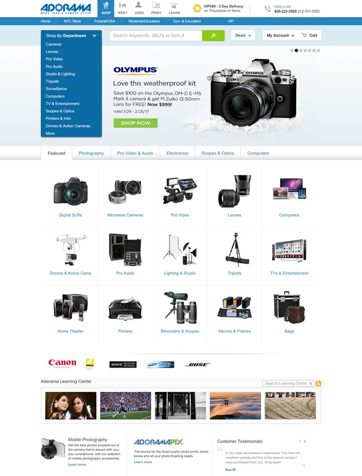 Adorama是美国一家以销售摄影器材为主的电商,成立近40年,是专业销售照相、影视器材和各类电子产品的经销商,也是全美口碑最好的摄影器材类B2C之一。各种专门的影视器材均能找到,如混音器、摄影棚搭建设备、显微摄像仪等。