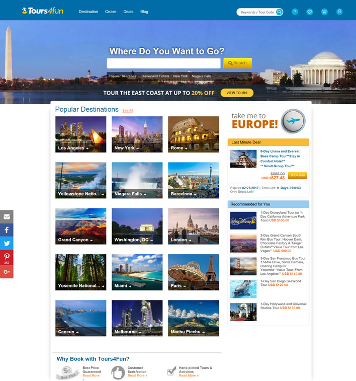 Tours4Fun成立于2006年,是一家正在蓬勃发展的线上旅行服务商,致力于提供最好的线上服务满足您的旅行需求。我们的专业人员在全球范围内联系值得信赖的当地供应商来为您找到最佳且具性价比的旅行和活动。由于我们极具战略的合作,全球内我们能提供超过85000家酒店的住宿折扣。满足您旅途中的需要让您可以全身心地享受旅途也是我们追求的一部分,现在我们的业务范围已经拓展到机场转机服务,停靠港旅行和旅行套餐等,保证低价和24/7的优质客户服务。