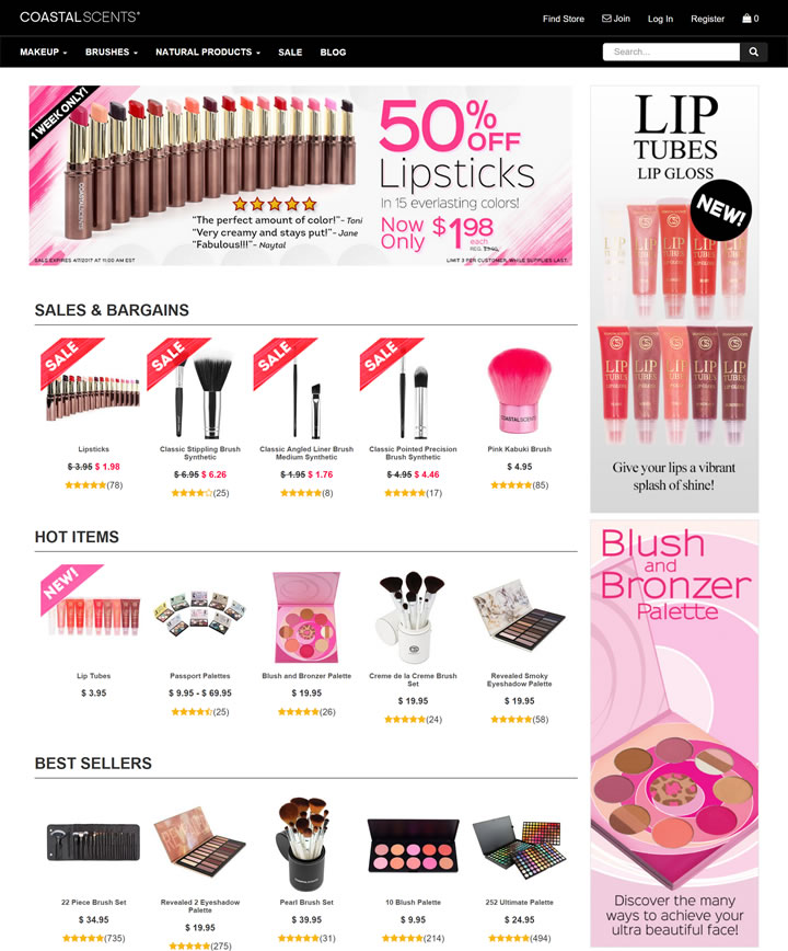 Coastal Scents成立于2005年,美国首屈一指的化妆品品牌。提供超过800个实惠的美容产品,包括:眼影、睫毛膏、粉底、腮红、化妆刷、唇膏及更多。
