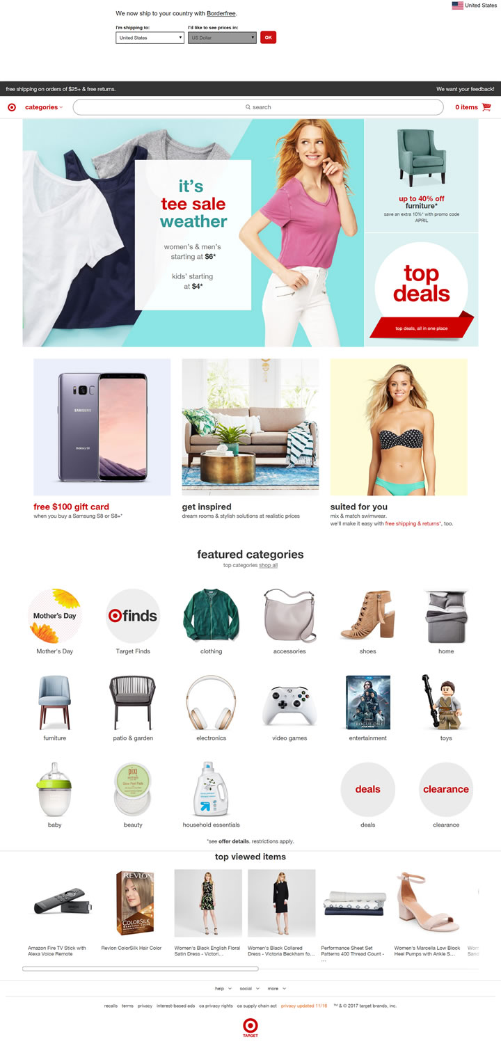 Target是美国第四大零售商之一,全球500强企业之第33名,其市场定位是高级折扣零售店。塔吉特百货公司和众多时尚设计师和时尚品牌合作,包括:著名建筑设计师Michael Graves、Mossimo Giannulli、Fiorucci、Liz Lange,时尚手袋设计师Joy Gryson、时装设计师Isaac Mizr 的合作,和匡威 (Converse)、苹果 (Apple iPods)、索尼 (Sony)、任天堂 (Nintendo) 等著名时尚品牌的合作,提供独属于塔吉特百货的平价时尚产品。