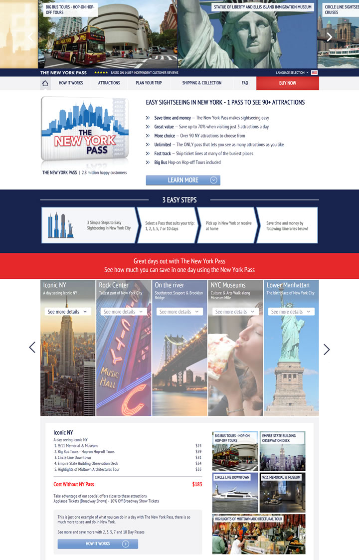 轻松畅游纽约:一卡在手,免费游览纽约市90多个景点。纽约通行卡的节省额不可小觑,可它不只是省钱而已。纽约通行卡将用一个全能概括的通票来便捷游览整座纽约市的方式变为可能——您可以尽情地参观所有的景点,在热门的景区享受快捷通道入场的权利,还有“随上随下”观光巴士游可让您无限次地乘坐上城区和下城区两条巴士游线。持有纽约通行卡,让您极致体验纽约城。