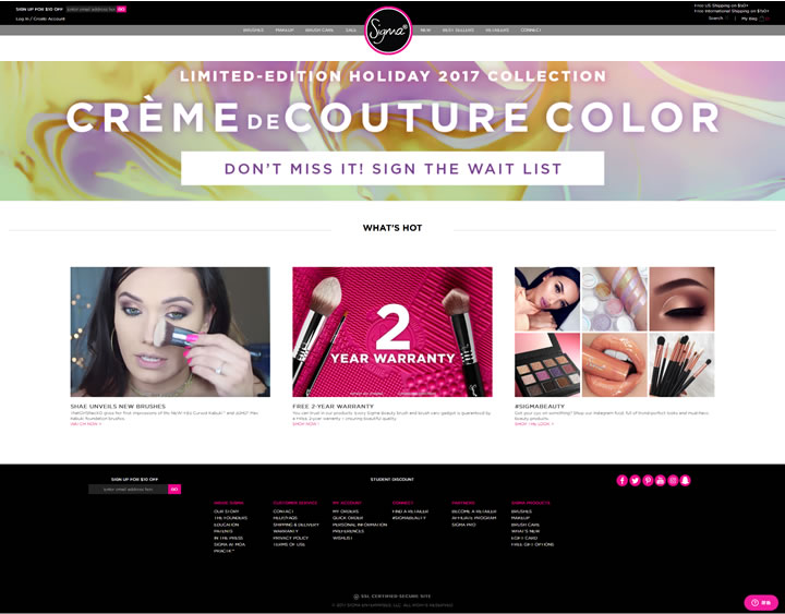 Sigma Beauty是美国彩妆品牌,网站主要卖化妆刷,以套刷为主,单把的刷子为辅,种类很多型号齐全,以12支专业套刷出名,每把上面都有相对应的编号。Sigma Beauty无论外表设计和毛质都非常好,性价比高,虽然价格低廉,质量却可以和MAC正品刷平分秋毫,深受很多美妆彩妆师和美妆达人的喜爱。