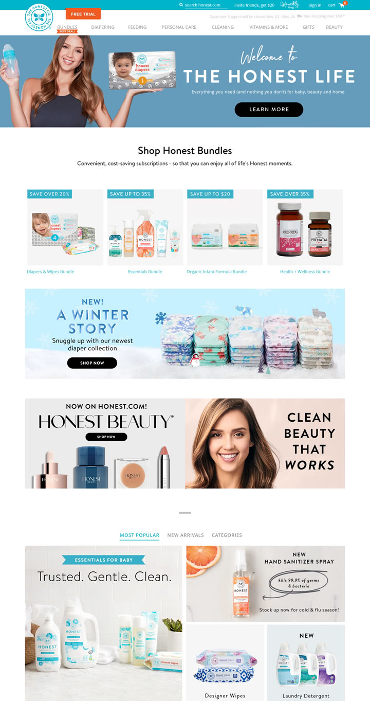 The Honest Company是一家由好莱坞著名女星Jessica Alba创建的婴儿用品公司,专门为新生儿家庭提供无毒、天然的婴幼儿及家庭用品。Honest主打产品为纯天然的尿不湿和牙膏,这些产品日益受到家长们的青睐,他们愿意高价购买这些环保产品,避免自己的宝宝过多接触不必要的化学物质。