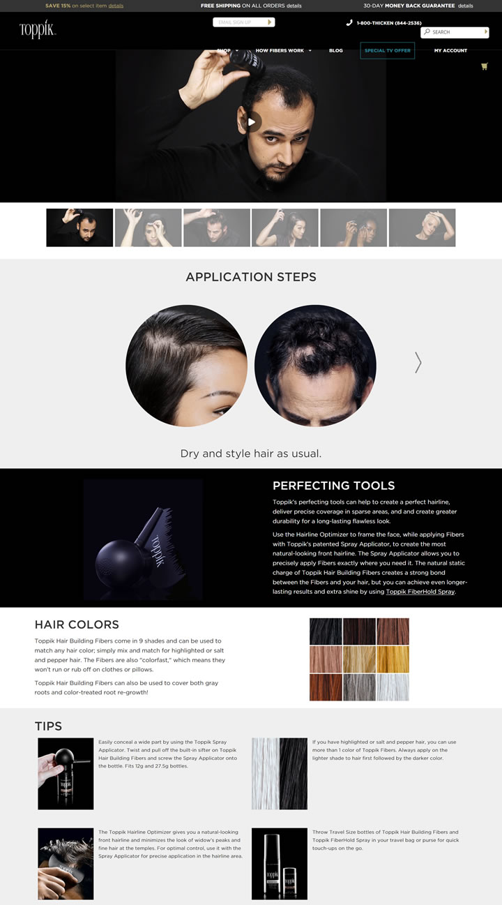 Toppik是全球第一大作为化妆品解决头发稀疏的领导者。Toppik增发纤维假发是一种细小的微纤维发,大小约0.3~0.5 mm,由跟头发相同结构的keratin蛋白质制造而成,不伤头皮,不阻塞毛孔。藉由静电效应跟头发紧密地结合,使细瘦的头发附着无数的微发,在视觉上能造成原本细瘦的头发变多变粗的效果。而头发稀少的区域看起来像立即长了新生的头发。即使近到5公分内也不会被发觉和一般头发的差异,而且使用方便,使用30秒后,即可看到使用成效。