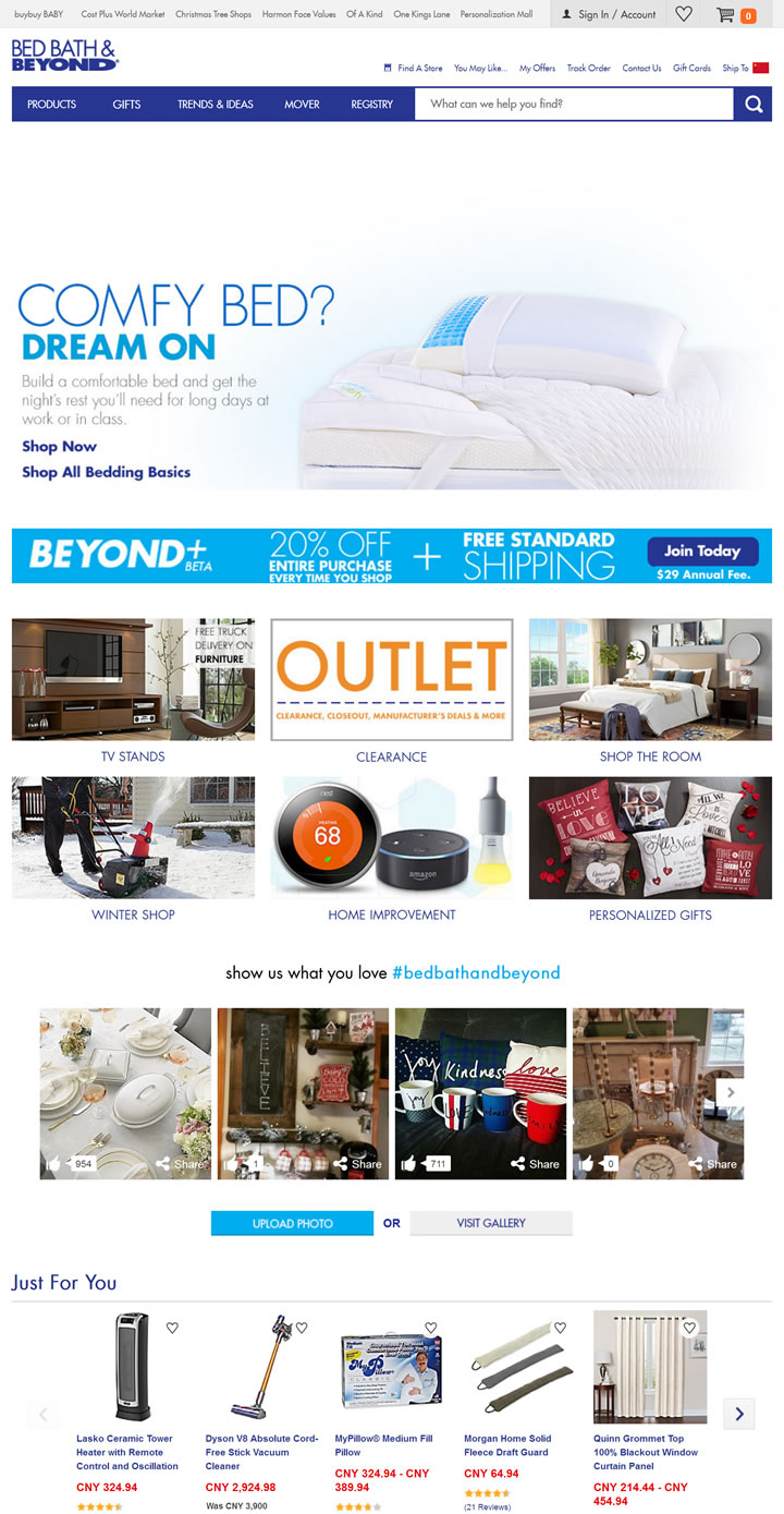 Bed Bath & Beyond是美国的著名家居用品购物网站,专营卫浴用品、床上用品、婴幼用品等商品。公司旗下的品牌包括Bed Bath & Beyond、Christmas Tree Shops、Harmon and Harmon Face Values与buybuy BABY。这家公司由莱纳德•范恩斯坦和沃伦•艾森伯格成立于1971年,总部位于新泽西州尤尼恩市。