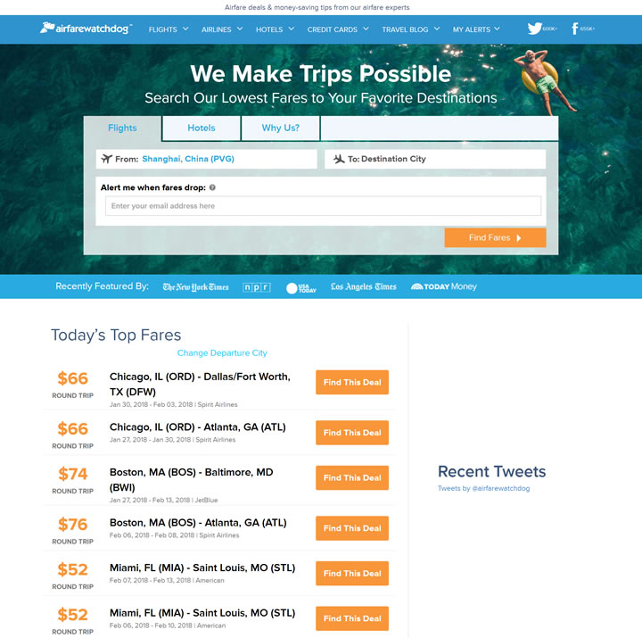 Airfarewatchdog.com是一家智能旅游媒介网络,不同于其余的旅游票务预订比价网站,Airfarewatchdog.com更加注重质量而不是数量,网站只列出值得选购且性价比高的票务,是一个更加人性化的比价网站。