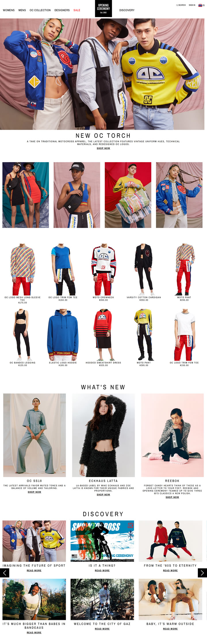 Opening Ceremony是一家时尚服装商店,商品涵盖男女时尚服装,鞋子,手袋和饰品等。多年来,OC与Rodarte,Topshop,Pendleton和Maison Martin Margiela等品牌合作,并以Spike Jonze,Terence Koh和ChloëSevigny等创意项目而闻名。