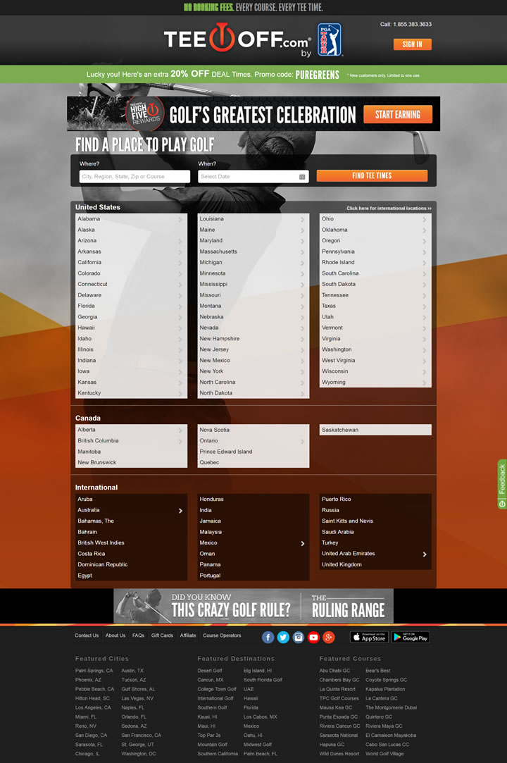 在线预订您的下一个开球时间!美国职业高尔夫球协会TeeOff.com是全美最大的发球时间预订网络,为全球超过3000个高尔夫球场的高尔夫球手提供24/7全天候超过50万次的发球时间。高尔夫爱好者可以在当地高尔夫球场以及世界上一些最受欢迎的高尔夫球场(包括棕榈泉、迈阿密、凤凰城、夏威夷、墨西哥、牙买加和多米尼加共和国)购买,高达50%的折扣。高尔夫球员将获得其他地方找不到的独家高尔夫球优惠。