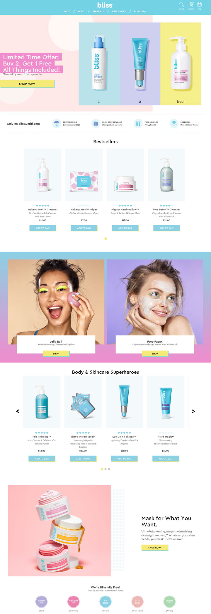 Bliss必列斯源于美国,由Marcia Kilgore小姐创办,品牌以全方位Spa生活定位。产品路线非常全面,拥有完整的护肤、彩妆、纤体、脸部护理、身体护理以及头发护理等系列,在销售产品的同时提供美容服务,在美国设有多间Spa会所,纽约总店更是客流如潮,要做一次Bliss必列斯的Spa往往需要等候3个月,所以特别推出系列产品,顾客可在家中保养肌肤,还能尽情享受Bliss必列斯带来的无限欢愉。