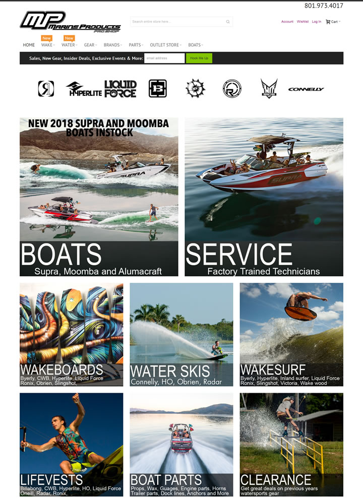 美国顶级水上运动专业店,销售滑水板、水上滑雪板、船、船部件、船用五金等。Marine Products自1971年开始营业,有2个盐湖城地区的商店可以亲自参观,还有一个完整的在线购物平台。