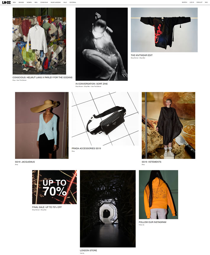 LN-CC不是单纯的网络店铺,他更像是伦敦时尚生活的缩影。LN-CC的风格简约而前卫,俨然如同Dover street market的网络版本。相对中间值的轻奢定位,让他在保持时尚度受年轻人追捧的同时,也有一定的商业独特性。