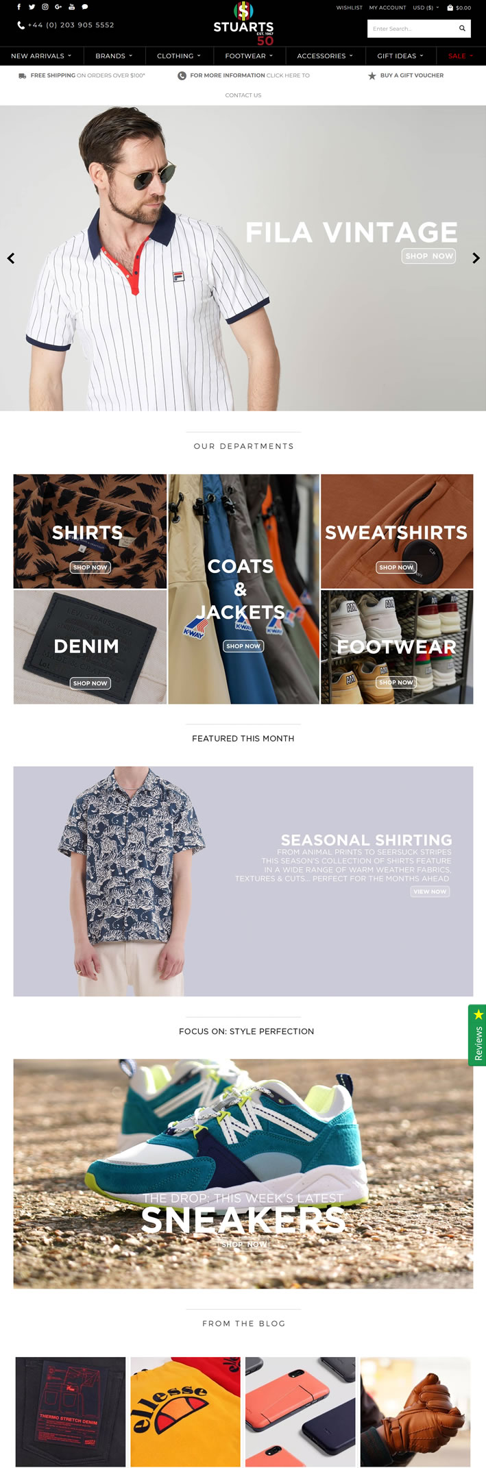 2017年庆祝成立50周年Stuarts London是世界上最受尊敬的男装零售商之一。我们在网上和店内备有超过150种男装品牌,涵盖了从传统到现代的各种风格,包括Adidas Origianls、Armani Jeans、Baracuta、Grenson、Fila Vintage、Kestin Hare、Orlebar Brown和Nike等品牌。