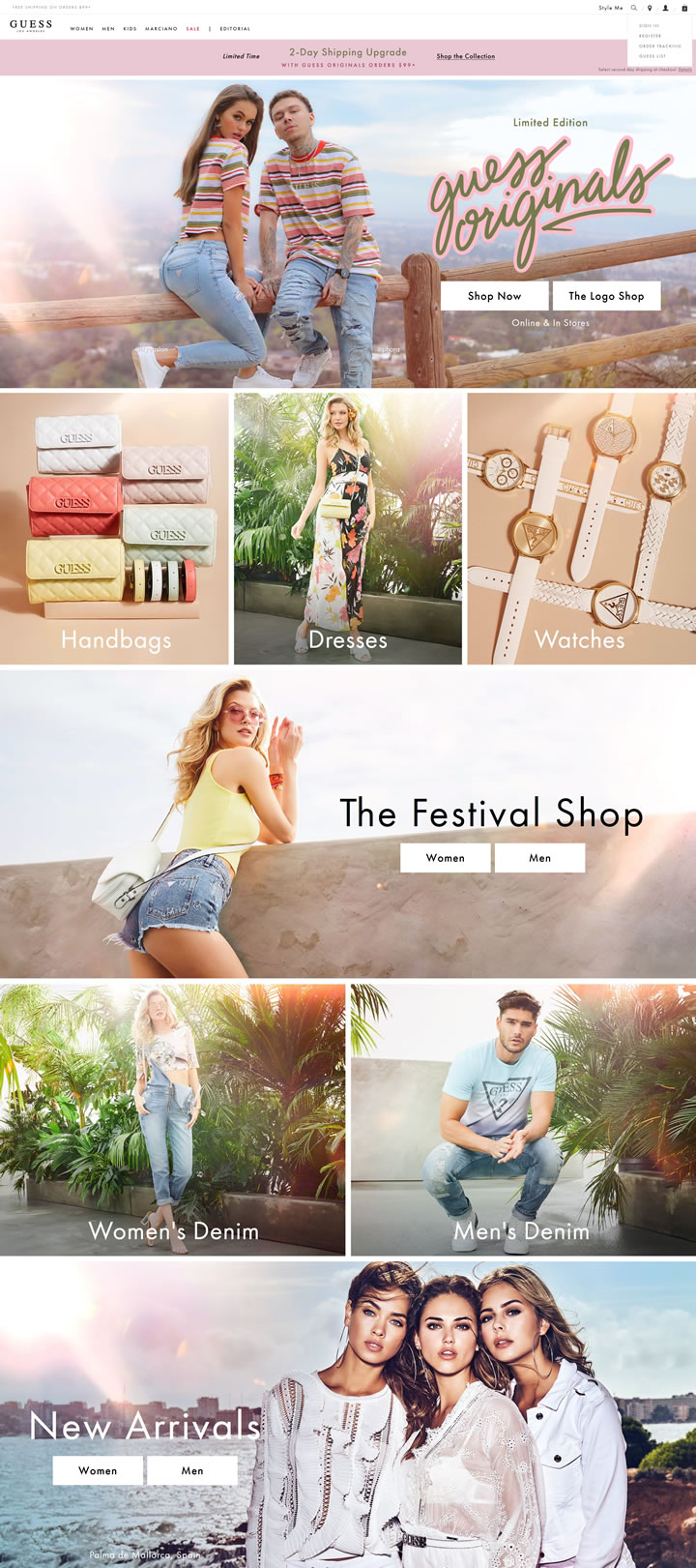 美国知名服装品牌,自1981年起持续成为潮流的风向标,GUESS品牌向来诉说着前卫、性感、经典而时髦的潮流态度。主要经营男女时装、童装、泳装、鞋履、钟表、精品配饰、手袋、眼镜、香水、行李箱等。