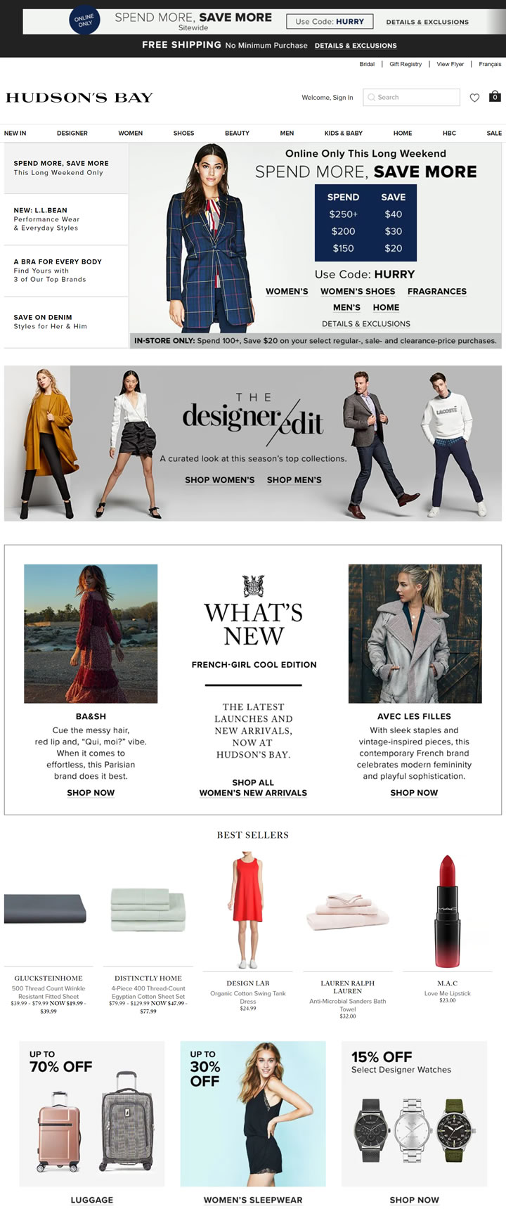 Hudson’s Bay是加拿大的标志性百货公司,网站销售手袋、男女服装、鞋子和家居用品。订单超过99美元,免费送货。