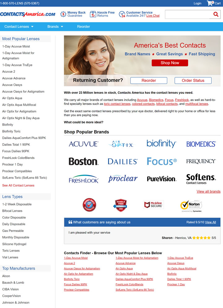 拥有超过2千3百万种隐形眼镜,Contacts America可以提供您所需的隐形眼镜。我们拥有所有主要的隐形眼镜品牌,包括Acuvue、Biomedics、Focus、Freshlook,以及难以找到的特种镜片,例如复曲面隐形眼镜、有色隐形眼镜、双焦点隐形眼镜和多焦点眼镜。