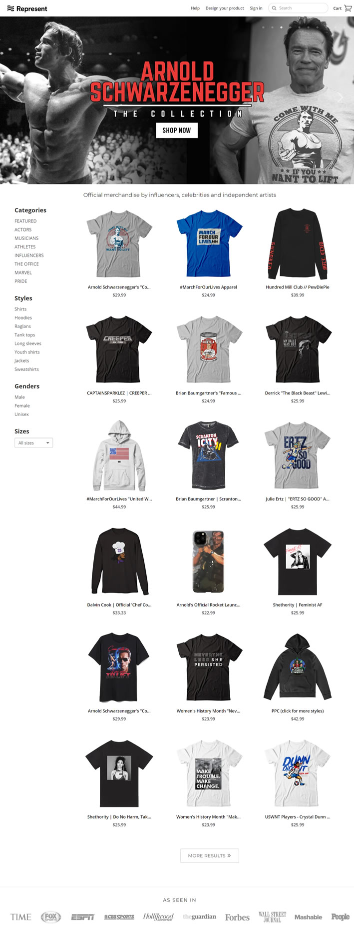 Represent与世界顶级的演员,运动员,音乐家等明星,影视IP合作,制作官方周边商品出售。客户包括漫威系列, Kobe Bryant,Arnold Schwarzenegger,Ice Cube,PewDiePie,Lionel Messi,Ronda Rousey,Kevin Hart,Mark Tuan,Matthew Mcconaughey和Leonardo DiCaprio等。 这些名人和有影响力者中的许多人都使用Represent作为其首选慈善机构筹集资金的一种方式。提供的典型商品包括T恤,运动衫,帽衫,帽子,包,海报和大头针等。
