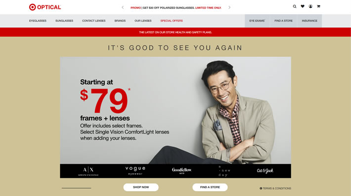 Target Optical是美国最知名的品牌之一,也是互联网上增长最快的光学网站。消费者在Target Optical购买时尚品牌的处方眼镜、非处方眼镜和太阳镜。我们拥有多种款式和品牌,如Ray Ban、DKNY、AX、Maui Jim®等,以及Acuvue®、CIBA®、B&L等知名品牌的隐形眼镜,价格极具竞争力。