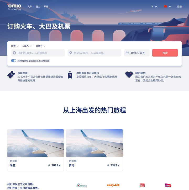 Omio是一个可在英国和欧洲使用的旅行搜索引擎。我们为您比对来自超过600家公司的列车、巴士和航班,只为找到最快最便宜的旅程。