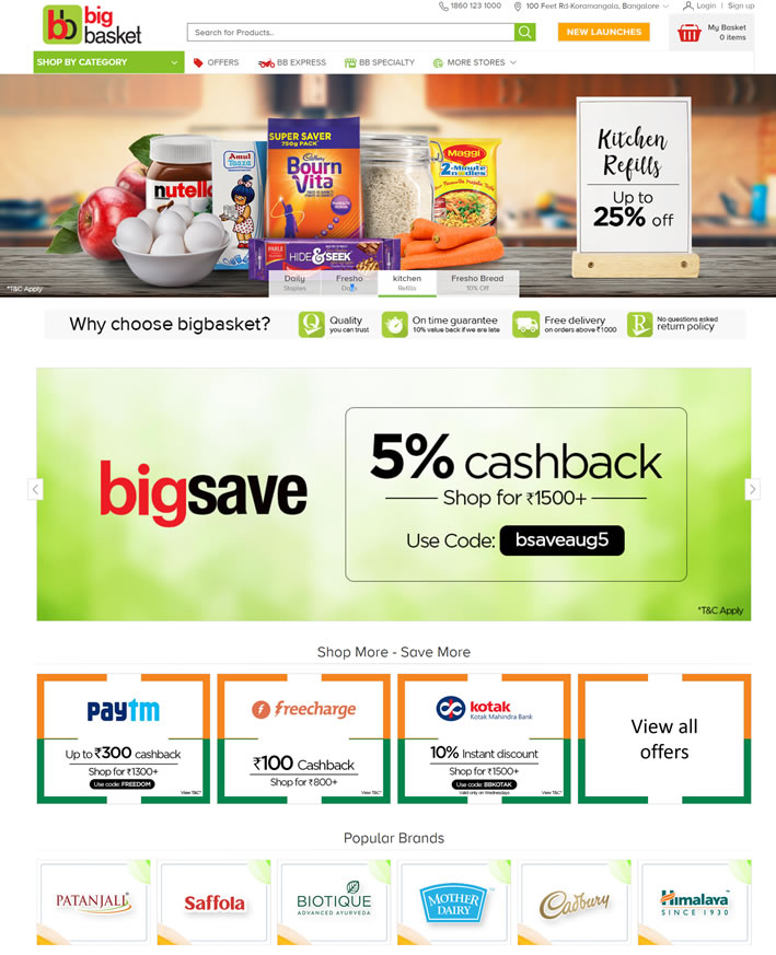 你有没有想过最新鲜的水果和蔬菜,顶级豆类和食品谷物,乳制品只需点击一下按钮,就可以手工挑选出数百种品牌商品并送到您的家中?印度首个综合性在线大型商店bigbasket.com为超过400万的客户带来了超过1000个品牌的20000多种产品。从家居清洁产品到美容和化妆,bigbasket拥有您日常所需的一切。