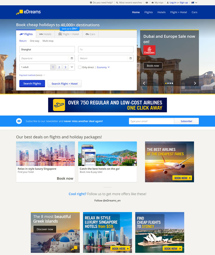 eDreams是一家领先的电子商务旅行社,通过我们高度发达的搜索引擎,为超过440家航空公司的客户提供超过6万条航线,以及全球40,000个目的地的超过100万家酒店,以及度假套餐和汽车租赁服务。eDreams的目标是以最具竞争力的价格提供最广泛的航班,酒店和度假套餐。