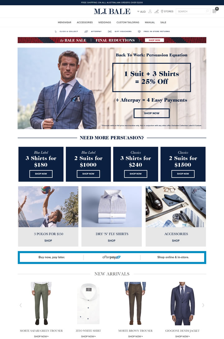 M.J.Bale是一个澳大利亚男装品牌,也是2014巴西世界杯澳大利亚国家足球队服装赞助商。M.J.Bale为挑剔的绅士们提供量身定制的男士西服、燕尾服、外套、长裤、衬衫以及更多男士时装。该品牌利用一系列全球工匠 – 从澳大利亚美利奴羊毛制造商到意大利纺织大师 – 提供最高质量的产品。