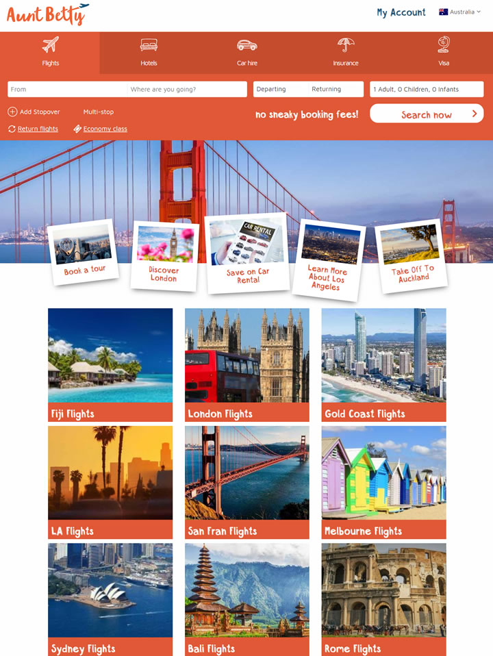 Aunt Betty从一个小团队成长为澳大利亚和新西兰最大的在线旅行社之一。我们为机票、酒店、汽车租赁、保险等提供优惠的价格。