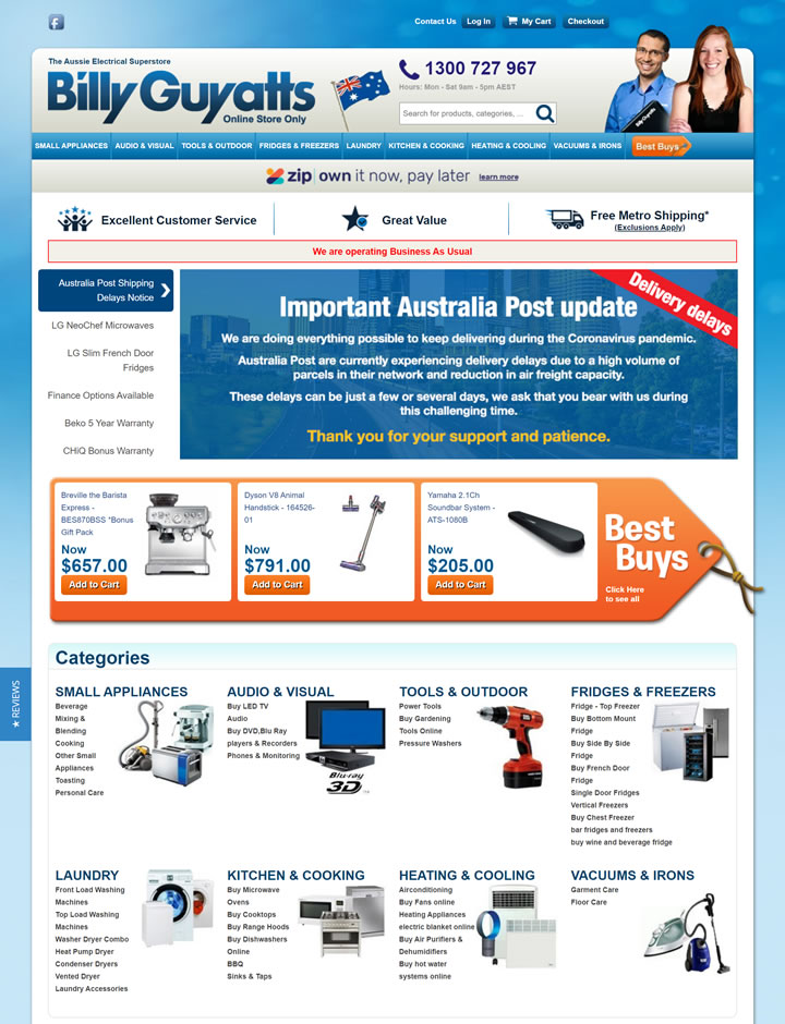Billy Guyatts是澳大利亚最大的家用电器在线零售商之一。从我们的在线商店中选择冰箱、洗衣机、加热器、电视、吸尘器、熨斗、洗衣机和所有其他家用电器,以照顾您的所有购物需求。
