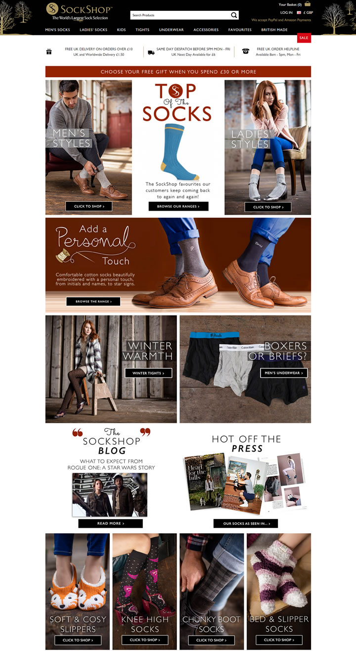 Sock Shop – 提供大量的袜子、紧身衣、内衣和配件。已经发展了30多年,我们是袜子和紧身衣的专家,我们提供一个巨大的在线袜子系列! 拥有超过50个伟大的品牌,包括Pringle、Heat Holders、Falke、Nike、Burlington等等。