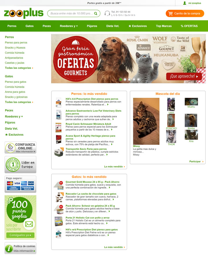 zooplus – 欧洲和西班牙在线宠物商店领导者,为狗、猫和小动物提供便宜的饲料、湿粮及配件。39€免费送货。