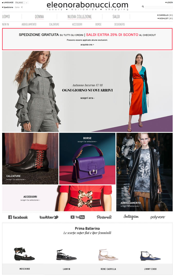 Eleonora Bonucci于2007年创立以来,迅速发展为意大利的领先的线上奢侈品销售电商,销售品牌涵盖ALEXANDER McQUEEN、MOSCHINO、CANADA GOOSE、FURLA、GIVENCHY、JIMMY CHOO、KENZO等。