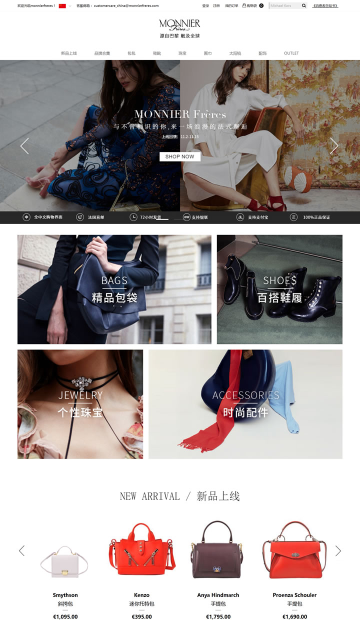Monnier Frères成立于2010年,由Jean和Guillaume Monnier两兄弟创立。成立至今,已经成为法国领先的奢侈品配饰在线零售商。 Monnier Freres品牌商品丰富,涵盖了Michael Kors、Tory Burch、Marc Jacobs、Kenzo、Acne、3.1 Philip Lim、Alexander Mcqueen、Stella McCartney、Furla等品牌。全中文购物界面,物流全程可跟踪,付款方式支持银联、支付宝和微信付款。购物满100欧包邮。