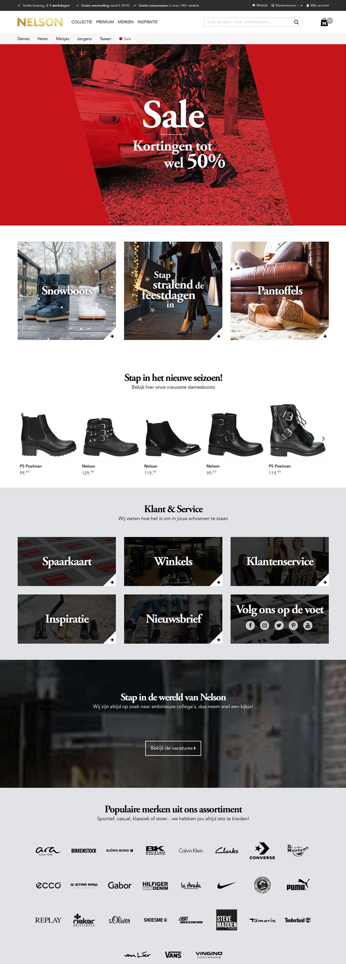 Nelson Schoenen是一个家族企业,自1949年以来一直为女士们、先生们和孩子们提供漂亮的鞋子。从最新的趋势到最佳的穿着舒适度,Nelson为您提供各种顶级品牌的鞋子。您可以轻松地在线订购,也可以去我们的90多家商店之一!