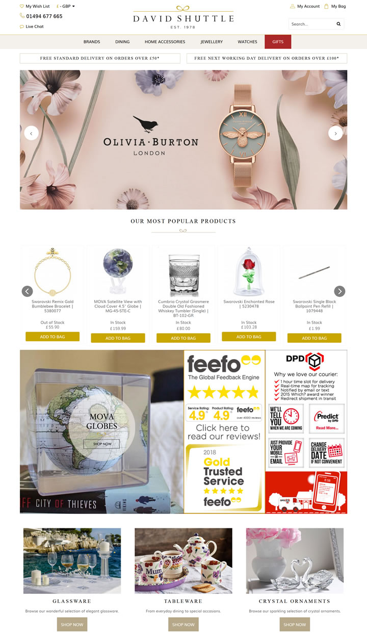 David Shuttle Ltd是一家传统的家族经营零售商,总部位于英格兰白金汉郡的比肯斯菲尔德市镇。我们在比肯斯菲尔德的中心有两家商店:珠宝钟表精品店和家居礼品精品店。在2008年,我们推出了我们的网站,提供同样多元化的价格竞争力的品牌产品,包括最新的收藏品和有选择性的罕见的受欢迎的作品。