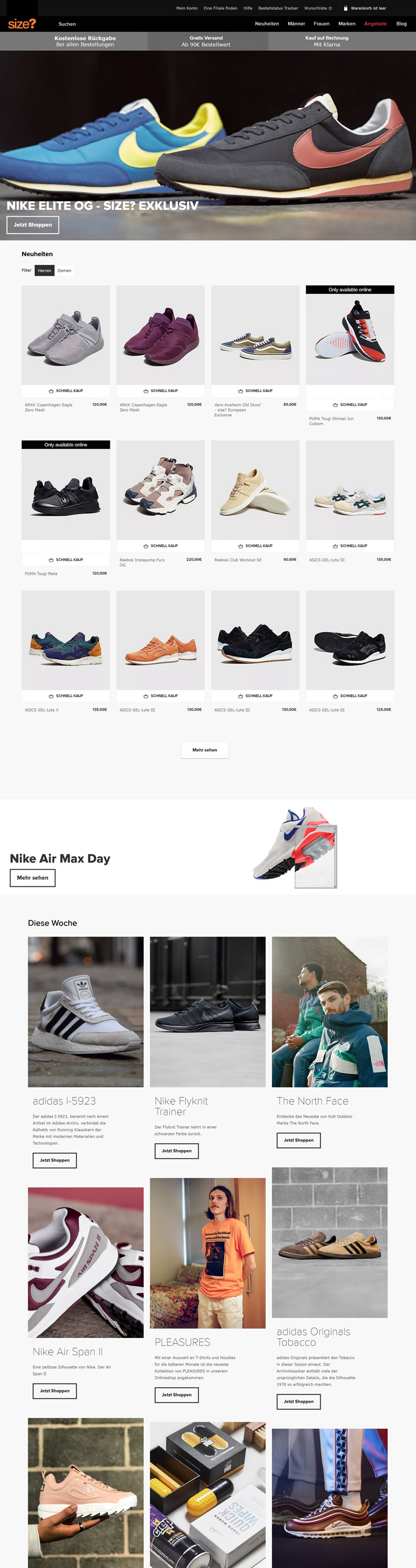 size?是英国伦敦的球鞋精品店,销售的产品主要是各大品牌的知名系列,包括耐克的AJ系列、阿迪、亚瑟士等鞋款,是引流球鞋界潮流的先行者。近年来上升非常迅速有很多的线下实体店,经常还有限量款的发售,也经常会有一些联名款式出现,很受街头潮流爱好者的喜爱。