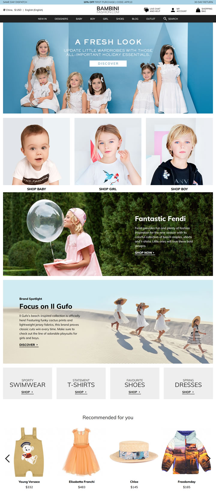 Bambini Fashion是欧洲最大的奢侈童装网上零售商之一。我们品牌的优势在于我们独一无二的来自Fendi、Dolce&Gabbana和Gucci等顶级设计师的最新潮流,以及与手工艺品牌的激动人心的合作。
