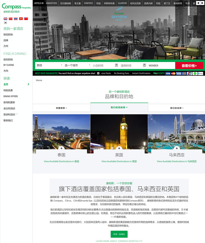 康帕斯(Compass Hospitality)是一家年轻及充满活力的酒店集团、总部位于泰国曼谷,欢迎客人前往泰国,马来西亚和英国的主要目的地。本集团有4个独特的品牌: Compass,Citrus,Citin和Ananda Spa(以及包括独立品牌酒店和度假村的Compass系列)、康帕斯提供各式各样的生活方式偏好和住宿需求,为您提供亲切的服务,带给您真正难忘的体验。