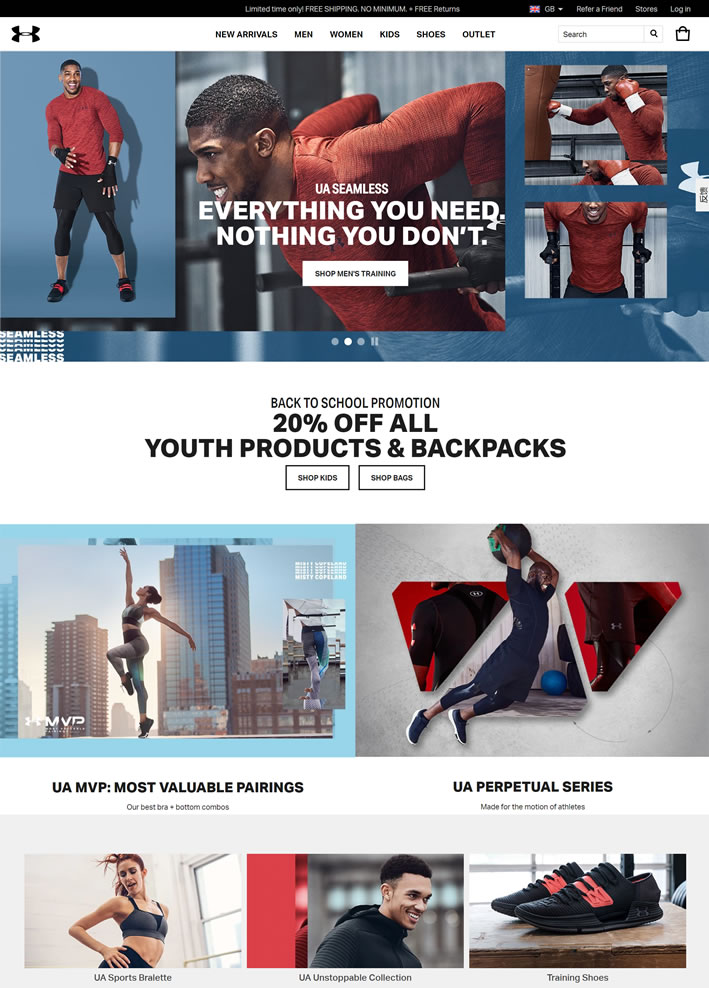 Under Armour(安德玛)英国官方网站。安德玛是美国体育运动装备品牌。由前马里兰足球明星Kevin Plank创建于1996年,总部位于巴尔地摩,是一家专业生产高端体育装备的公司。它的每一款运动紧身衣都有其独特的科技含量,受到了来自全球各地体育爱好者的喜爱。