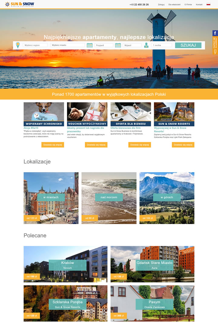 Sun & Snow提供度假公寓出租,位于海边山区和波兰最受欢迎的城市。Sun & Snow Sp. z o.o.是波兰最大的度假胜地和城市公寓租赁运营商,隶属于Sun&Snow SA集团公司。