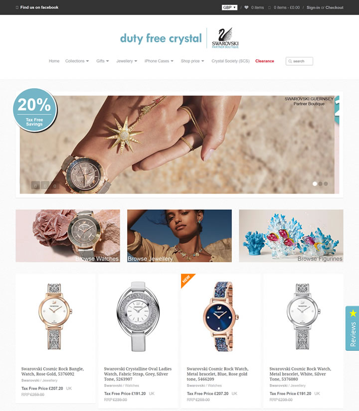 免税施华洛世奇珠宝、水晶雕像、手表、袖扣、戒指、iPhone手机套,年度版、手镯和SCS会员产品。比英国的商业街便宜20%。预付税和免费英国航运。免费礼品包装服务。提供国际运输服务。