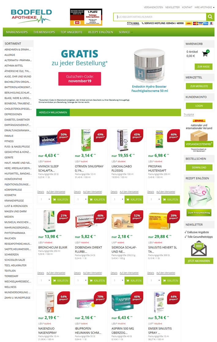 Bodfeld药房提供多种药物、营养补品和护理产品。由于受欢迎的品牌以诱人的价格和较高的客户满意度,我们获得了“ 2018年度最佳在线药房”的称号(根据DISQ)。