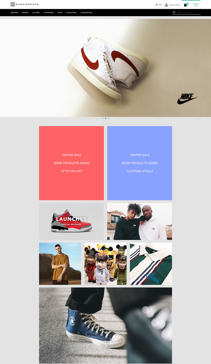 Nigra Mercato是一家运动鞋商店,位于马德里市中心,在历史悠久的Barrio de Las Letras中。我们与最好的服装和鞋子品牌合作,例如Nike、Adidas、Reebok、Asics、New Balance、Puma、Huf和Parra。