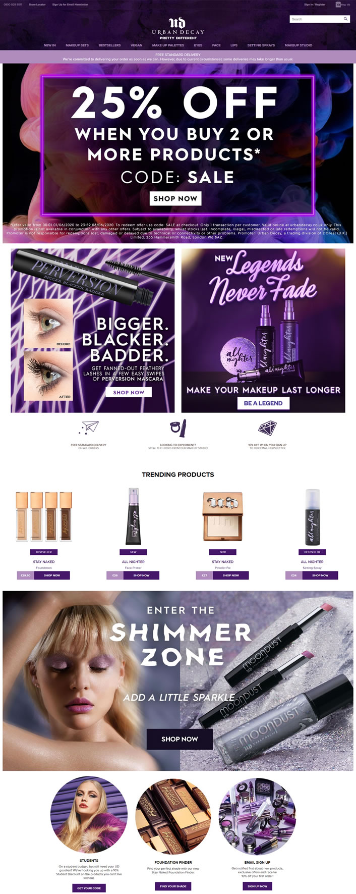 URBAN DECAY是美国彩妆品牌,创始人是Wende Zomnir于1996年创立,2012年被欧莱雅集团收购,其产品NAKED眼影盘系列创下了每7秒销售一盘的记录,从2010年推出至今已售出10亿盘。颜色前卫性感,带有时尚的色彩风格,鲜明、流光闪烁、虹彩耀目,主打玩百变的创意彩妆。