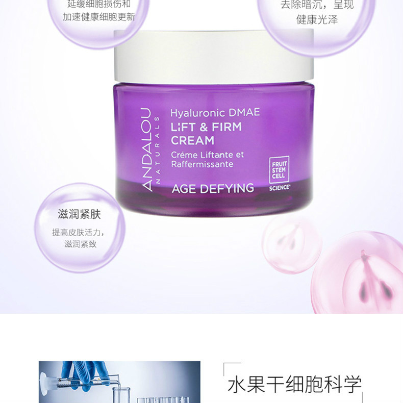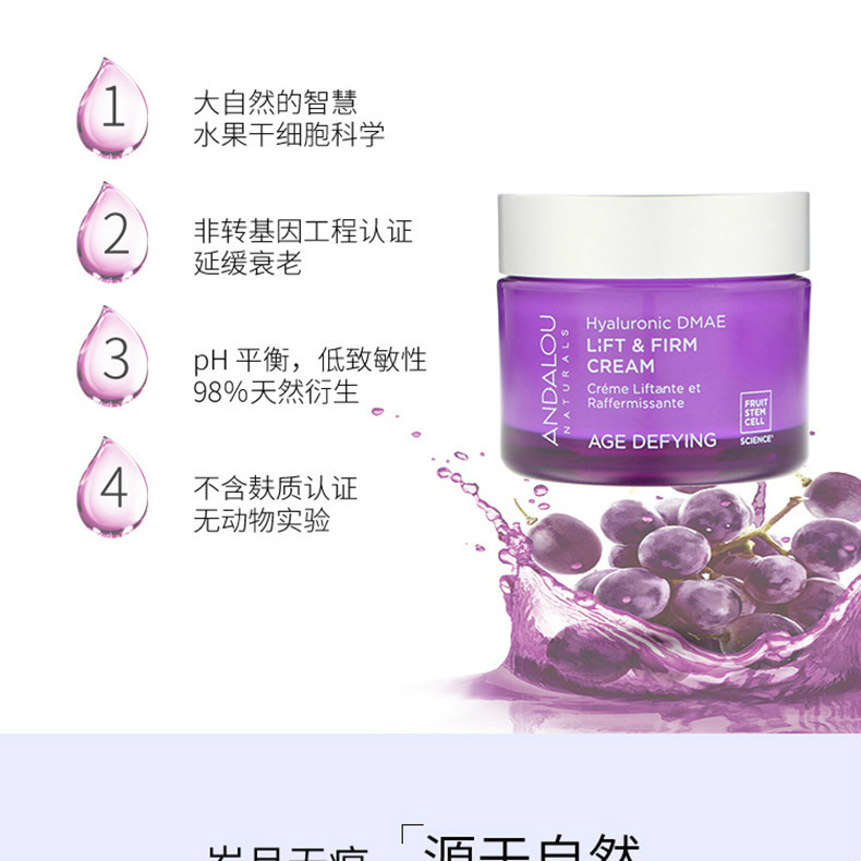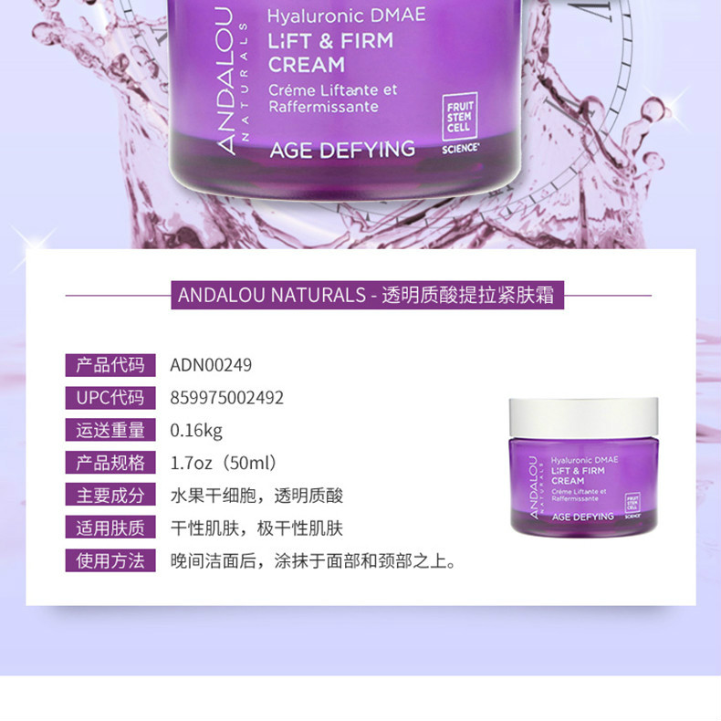 - 外文名称 :Andalou Age Defying Hyaluronic DMAE Lift & Firm Cream 50ml